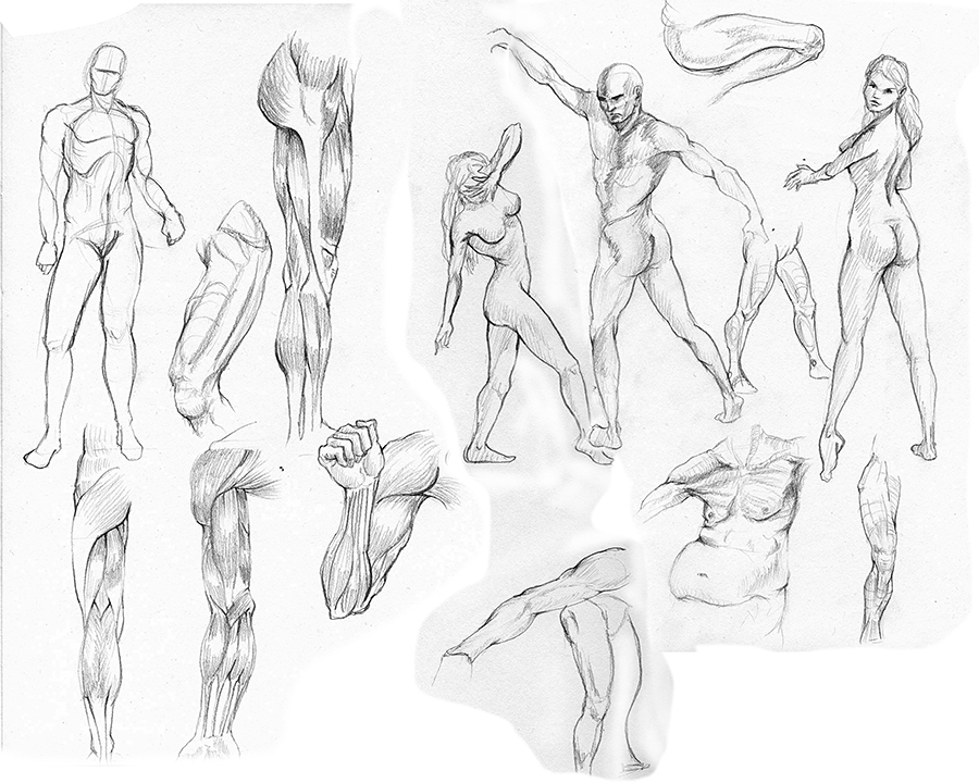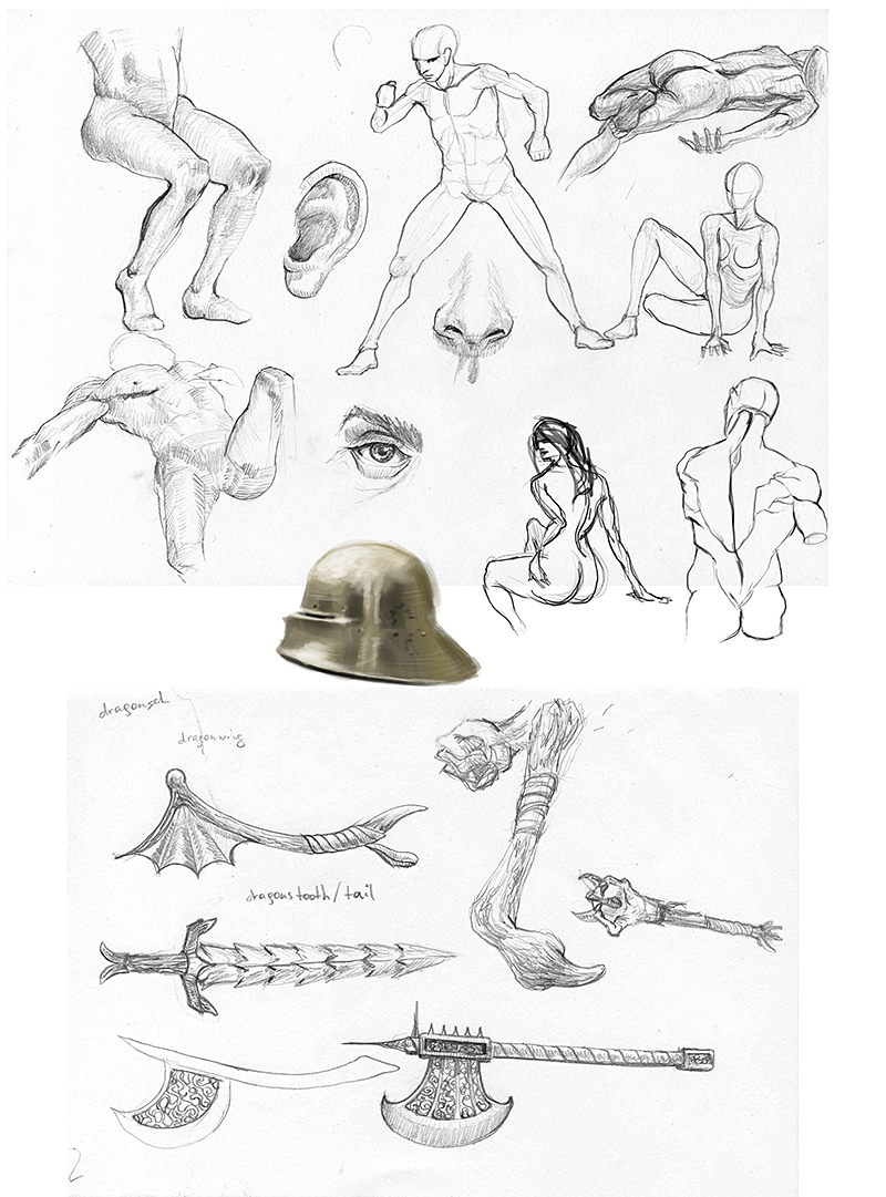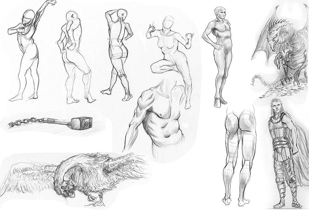 Some crappy anatomy studies, a small armor study and some sketches for a weapon sheet