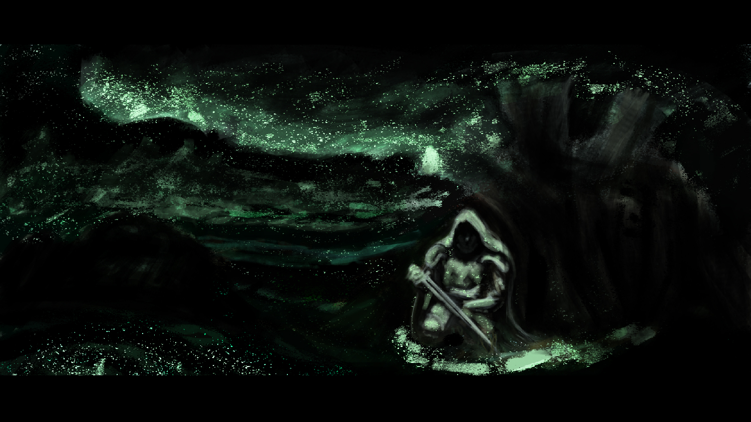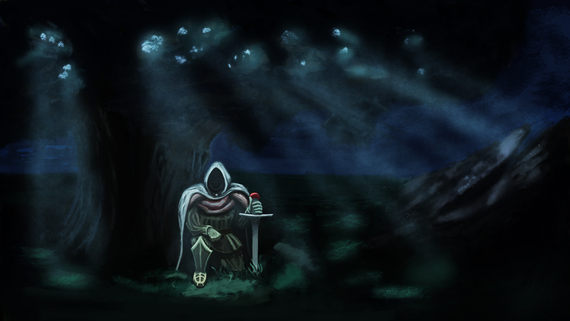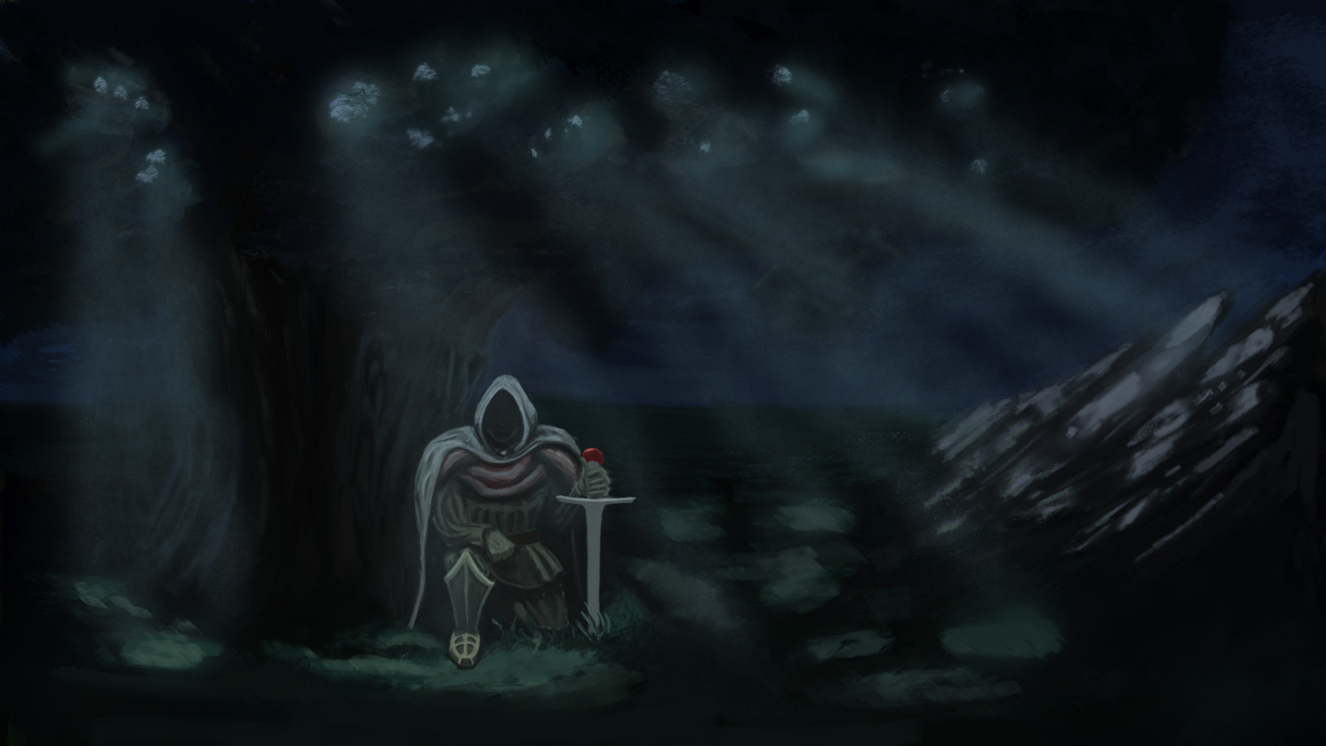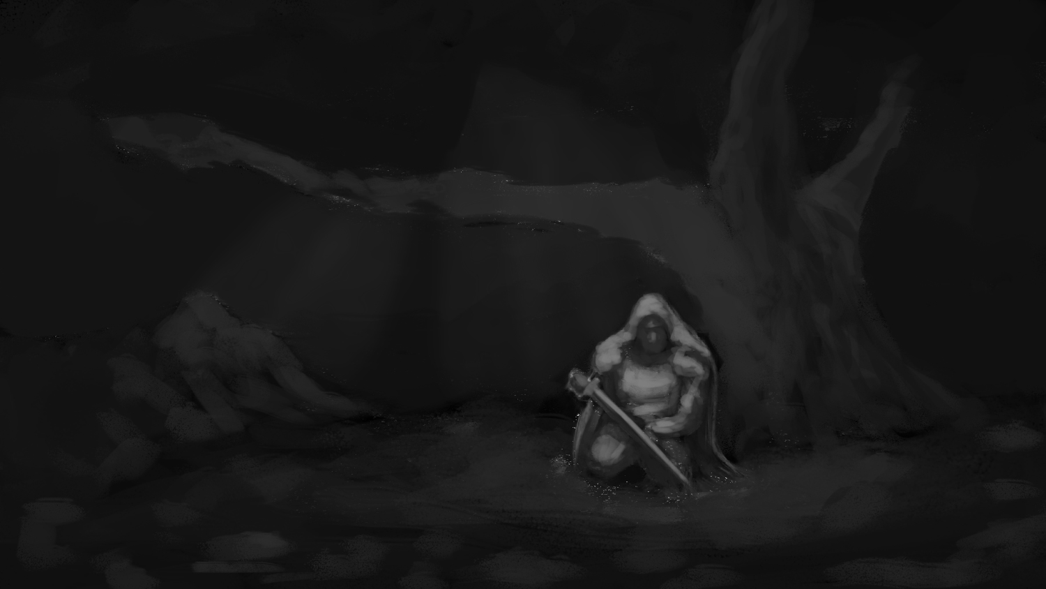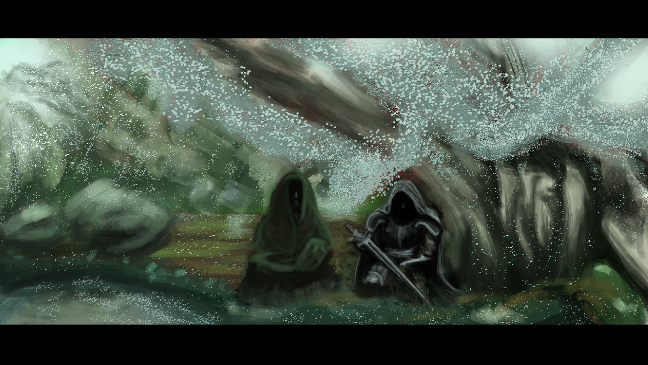 I would like you to help me with this piece, Its about this antihero warrior guy, that is resting in a magical forest, the 2nd character is supposed to be a monk of some sorts, although im thinking of scrapping him from the picture. Any advice and critique is appreciated.