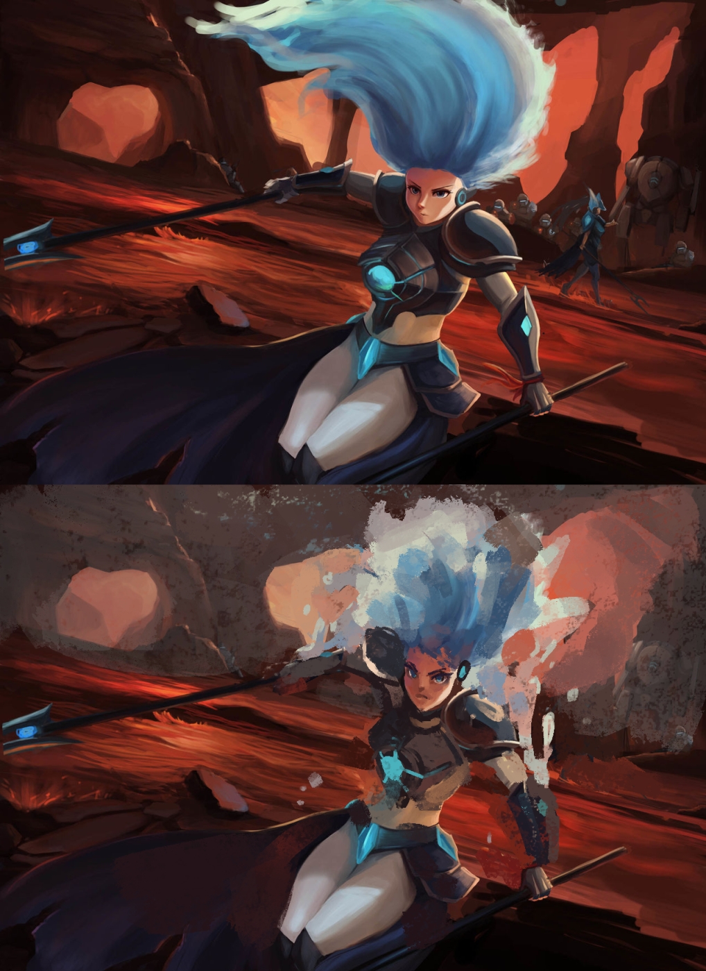 Third was to change the light source on the main character. you have a strong rim light that seemed to come from directly behind yet we cant see the source. It was a little inconsistent in places also. I tried to use the direction that you had hinted at on the legs. This could be a spot light from above showing the importance of the fight about to take place.