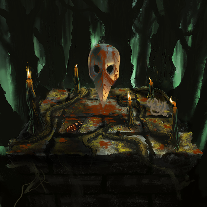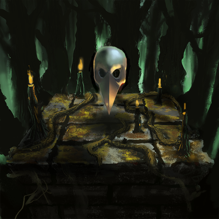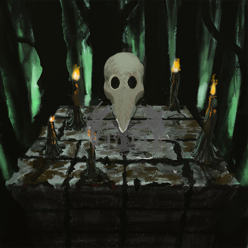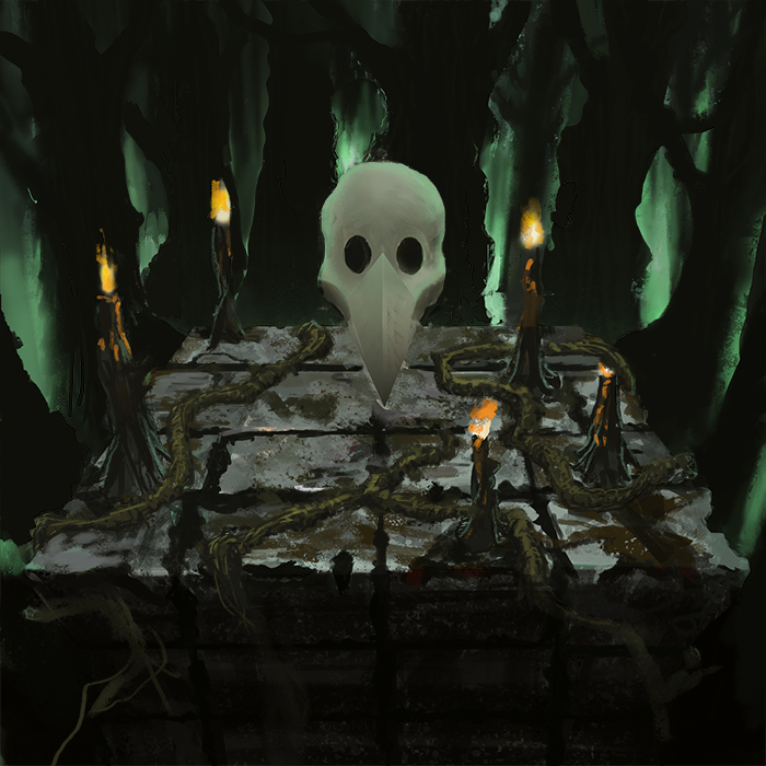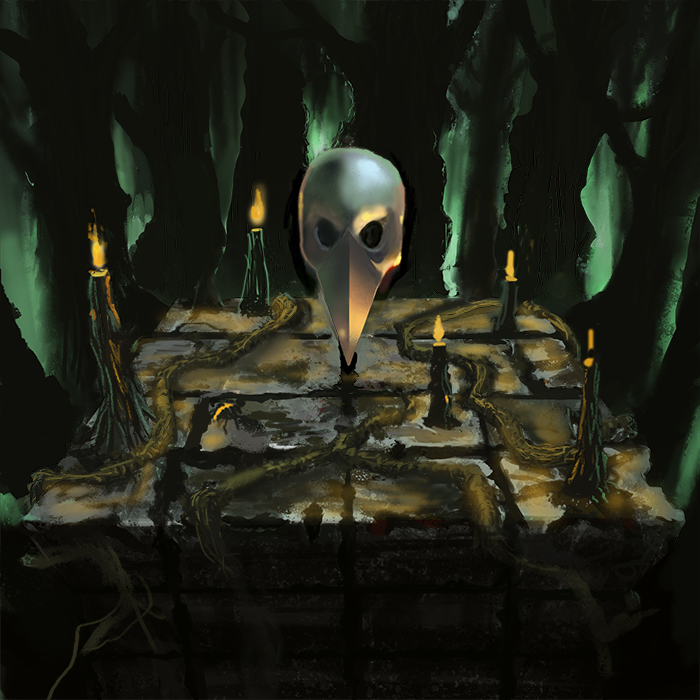 Nice work. For next time, I'd do more thumbs and nail the composition, values and lighting design a bit better. Looking at this piece technically, I'd say that you need to work on depicting volume using value changes, and how to make the best use of your edges to aid the composition. While you have the tighter edges at the focal point which is the skull, and is good, everything else has this wavery form, but with sharp, cut out silhouettes which I think really detracts from the sense of volume and depth in the piece. I also have very little sense of scale in the piece. Judging by the candles the mask looks less than full human sized, judging by the trees the candles and altar look huge. The mask material looks more like dull polished metal, than bone. Colour choices: I would recommend designing your colour palette with a bit more focus and intent, eg why that hue of green for the background, what is your gamut, and what are the base temperatures and accent (focal) colours? Perhaps pick colour palettes from already existing paintings, photographs or artwork to help gain harmony.