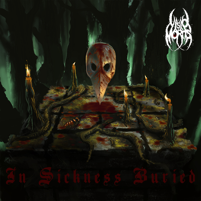 From a non technical point of view, think about what is going on here. There is a floating mask, some candles of unspecified scale, on an alter which is presumably bloodstained in a dark forest. You have managed to get across the sense of a dark metal album, which is a win. However, if I think about the scene, well I am left a little lost. I don't mean everything has to be explained, because that is just as bad, but perhaps a bit more clarity in narrative would help.