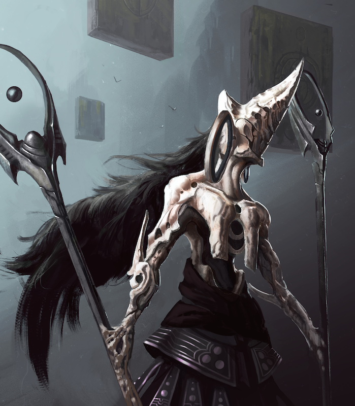 This creature is the angel, Azra. She can summon powerful creatures onto the battle. Most of the angels will share a few of the same design elements - bone-like bodies and circular forms. Wanted her design to sort of follow the appearance of a witch. Also, I thought it would be cool to fuse her hands with the staffs she uses. Anyway, enough bullshit. Just wanted to give you guys a general idea on what I was going for.