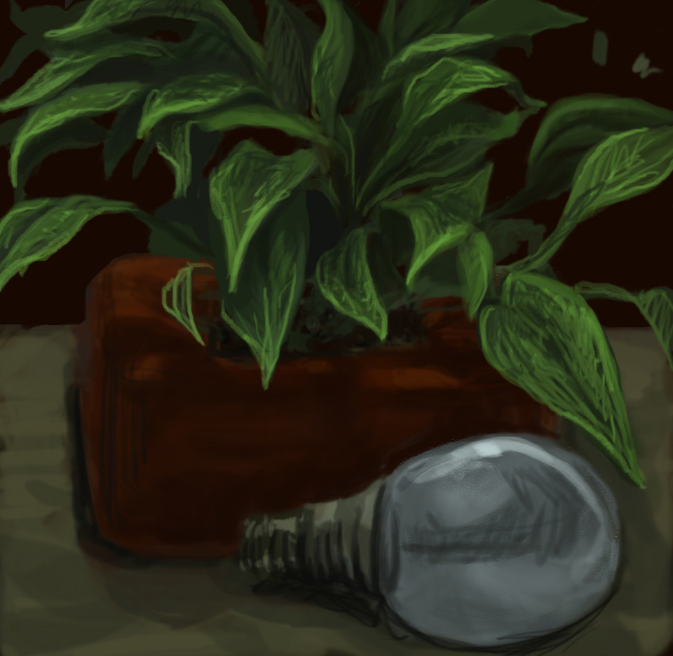 Something I didn't expect: When doing a still life of a plant, make sure to keep the plant well-watered! The little plant got a bit dehydrated and changed color/position between friday and today, so that was a challenge to keep up with.