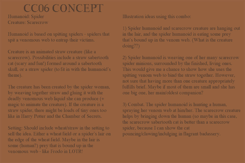 In case my splodges don't read: spider woman top right, in top down perspective, weaving some wheat in her hands, and sabertooth lying on the ground, with a crow under its paw. Birch trees to support perspective and flying crows to support composition. Crits and suggestions welcome :)