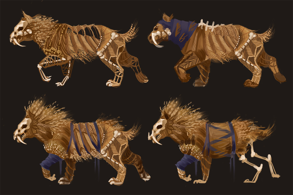 This afternoon's work was some development on the scarecrow saber-tooth idea. Gathered reference of corn dollies, and used that as a basis for how straw can be shaped, and sketched up these kitties.[