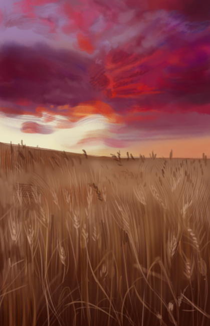 Before doing any rendering today, I've tried out some colour variations to see what I can come up with. I'm probably using the bottom left grey/gold combo. It feels halloweeny to me, and echoes the atmosphere of some of my inspiration refs, which had gold fields and dark brooding grey skies.