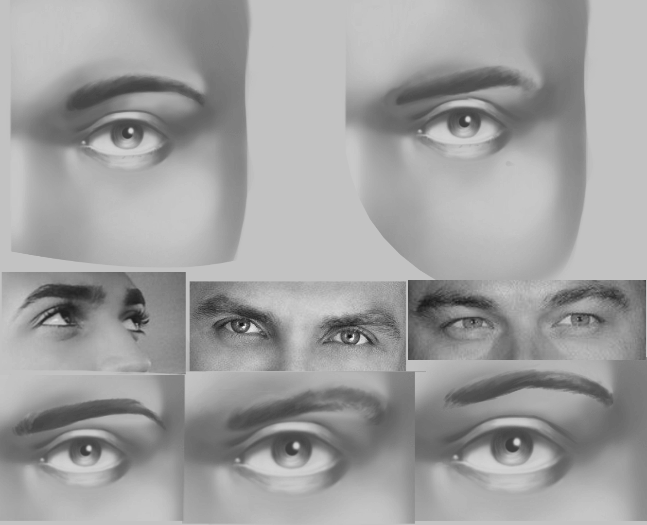 So think about the shadow shapes that the brow ridge creates over the sphere of the eye, the angle of the brows and so on. When you see a complex shape and you're not sure how to put in down on canvas, just try finding corners, simplify. The more corners you have, the more structured it is.