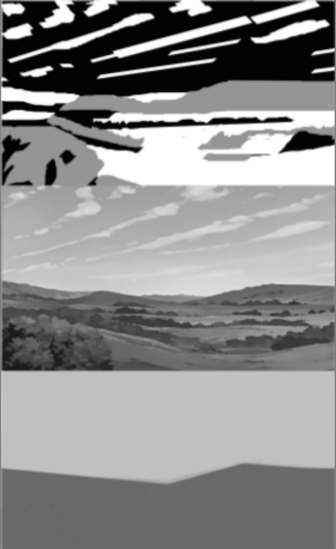 A two value notan of one of the weakest images. More value grouping of mid tones are needed in 2 value notan. More decisions need to bea made into whether to group something into the dark or the light. Sometimes the value you choose will be opposite to the side that the value is actually closer to (ie the sky could be black with white clouds and merge into the trees, or white sky resulting in black trees which shows that contrast relationship of the horizon better, but also results in black clouds. Or the clouds could just be ignored completely and set to white since they don't really add much to this particular composition, [attachment=108495]