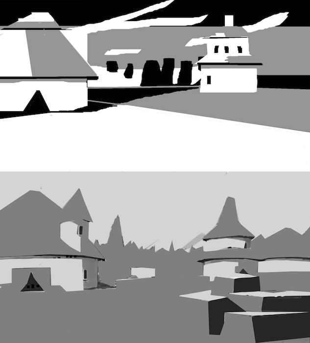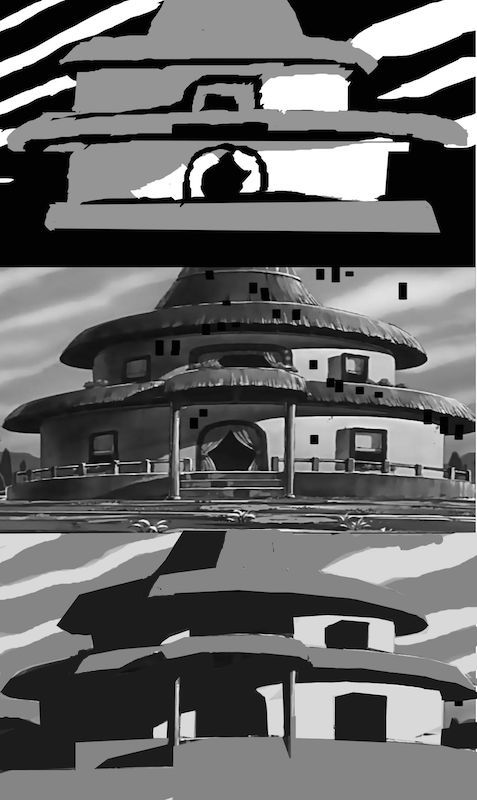 One thing I have to say, is that you use your whites to indicate both light and color of the object. I would choose one or the other. For example, in the first frame white shows both the light on the building and the color of the road. This makes it confusing, since it looks like the road is very shiny, which I'm sure is not the case in the original. I would personally focus on only showing light with white, core shadow with grey and cast shadow with black. If this means that the road is now indistinguishable from the grass, so be it. Because that's not the point, the point is to see how how certain objects are lit in a scene. Same can be said for the last image. White on black probably used to indicate color rather than light, but if we look at it from light perspective, it looks like there are some gloving objects in the sky.