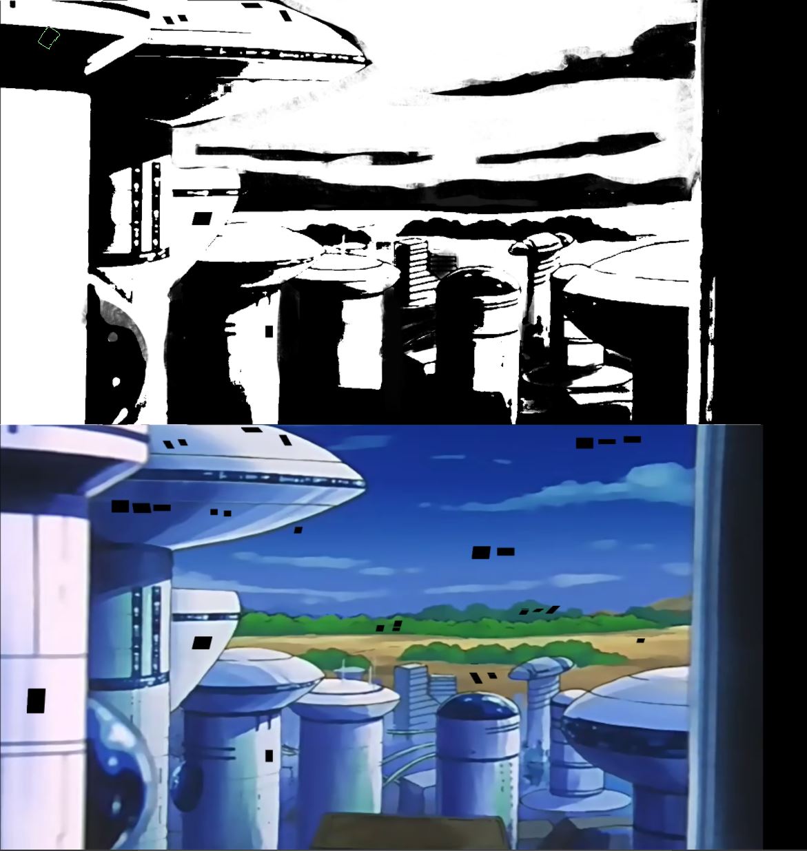 This is Dragon Ball, right? I think, as it is, it gives you more info on how to do lighting in terms of composition (i.e., how to spread dark, medium and light values across the page), but not that much on what values to choose. Since with values, it's all about the relationships between them, I don't think using only three for such complex backgrounds makes for a very productive study. I think you should try to use at least 5 different colors for this. It would make it easier and more productive.