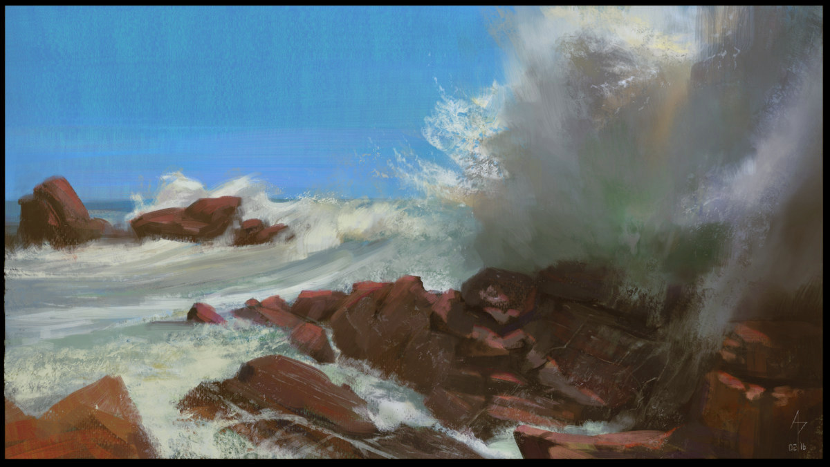 (02-24-2016, 04:13 PM)Amit Dutta Wrote: [ -> ][*]Brushes: One hard texture brush for spray and wave crests worked well. Soft round with a light touch to get that soft wave volume and glow.