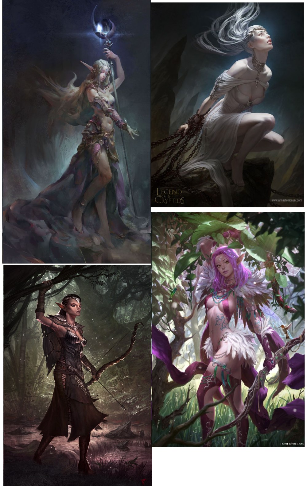 Again you are doing this ambient painting style with no obvious light source. You need to pick a main light source and apply this to all your forms consistently. Do a quick study of say that top right ref image lighting scheme, analyse the values and saturation, hues etc, then apply to your piece. Look at how your figure has no consistent shadowing of form, the underside of legs is same value as all the other sides of her limbs. Where is that light coming from, it should be in shadow. Things likethat will only make sense if you have a specific light source so you can map shadows.