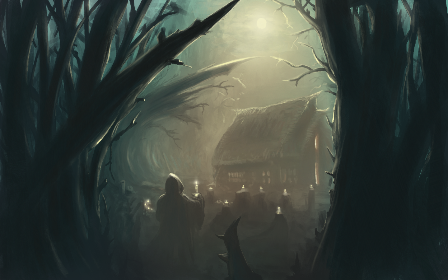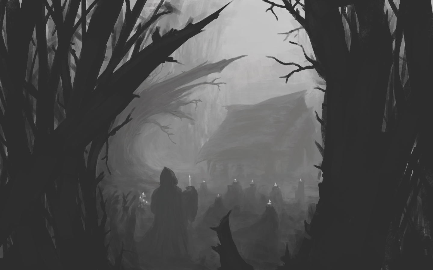 Also, I like your enviro piece, the atmospheric perspective works well i.e. the way you fade the values as you move into the distance. I agree with wld.89 about pushing your darks a little more - in particular the trees in the foreground could be darker. This would help you make the sky a bit darker as I believe this piece would work better as a night-time enviro - then you could make the sky darker and have the candles pop out even more.