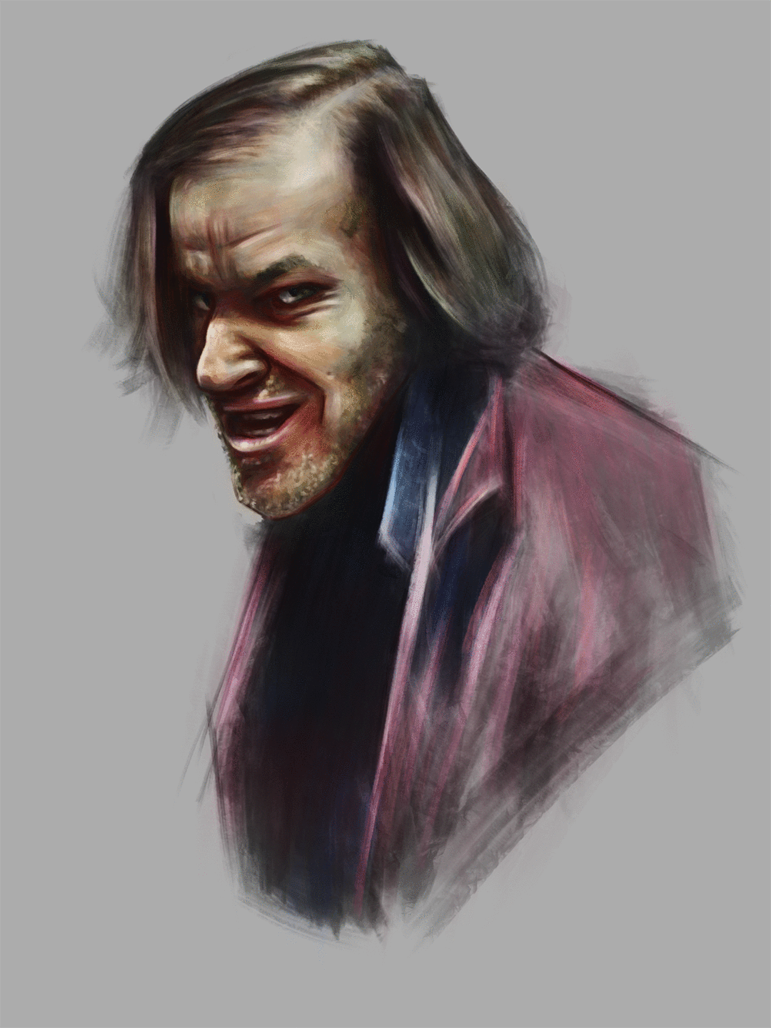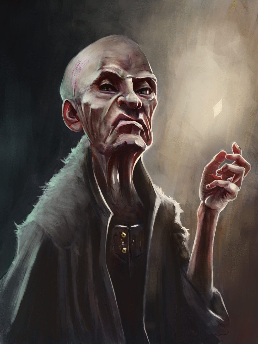 Really digging your evil dude - his expression is great and those hands are bloody brilliant. Just be careful of small anatomy things that throw the image off. For example, the back of his skull/neck. Follow your eyes from his occipital and notice how it's not connected to the back of the neck in anyway? It kinda looks like his neck sits in his jaw, making the back of his skull protrude out and giving him a floating mandible