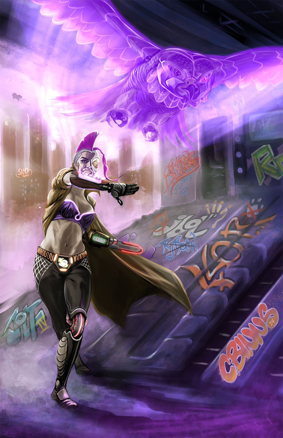 Traditionally, hunters in Asia and parts of Europe hunted with trained birds. Falcons, eagles, etc. This practice is ancient and comes with a lot of tradition and cultural clothing and appearance. For example, the birds may have a decorated hood. The falconer would wear gauntlets. We are looking for a falconer character that fights enemies alongside a fierce bird. It should make some kind of allusion to traditional imagery and shape language BUT here's the twist: It's in the future. Whether you want to go with retro-future sci-fi like fallout, or something like Cyberpunk is up to you. But try to transpose the ancient hunter-with-bird archetype to a new, sci-fi context. The bird would likely be robotic, mechanical, or cyborg, for example. A hunter's gloves or gauntlets might be made of a synthetic material and contain a homing device.