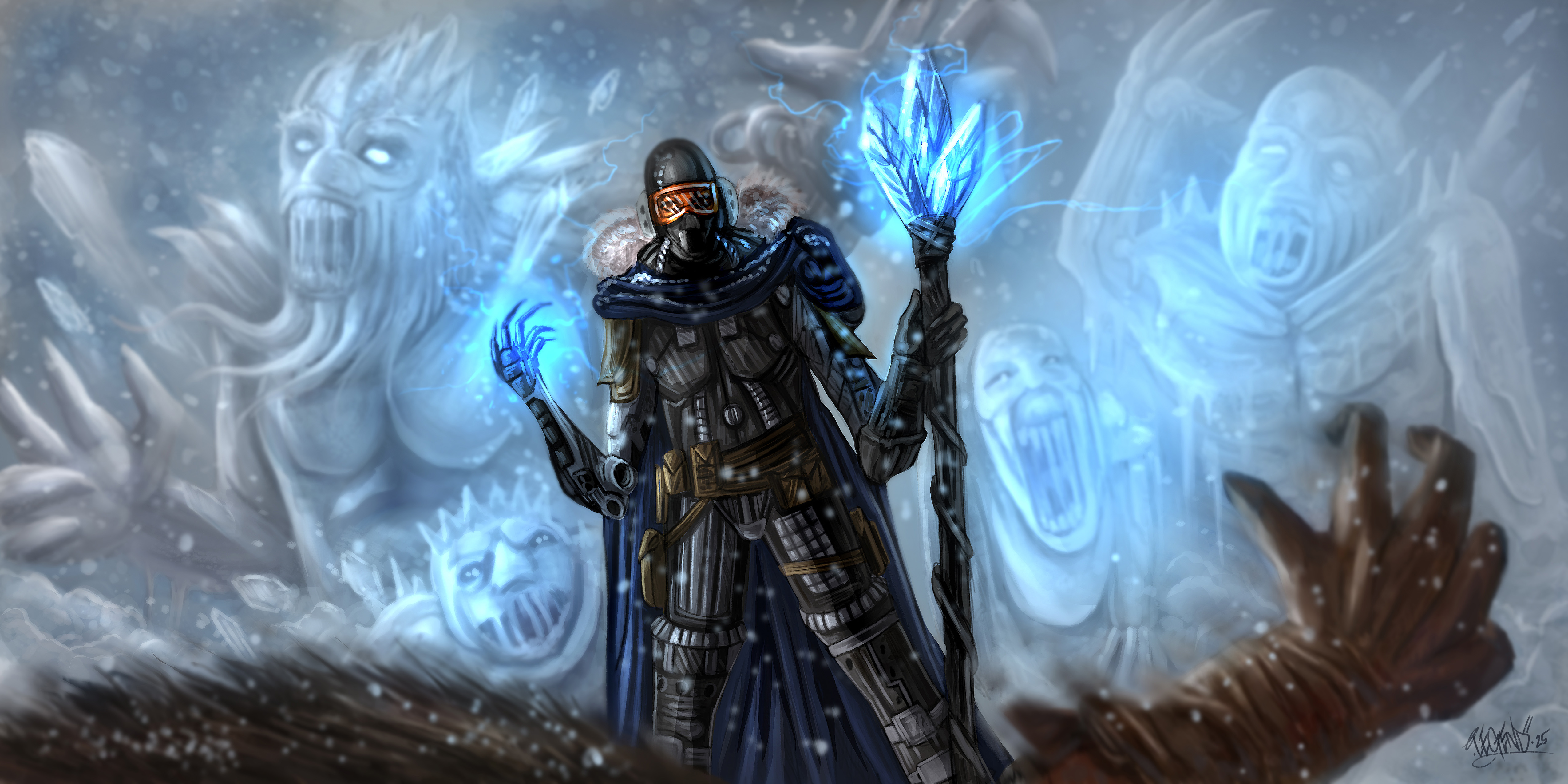 He extended his mechanical hand, the intricate gears whirring subtly beneath the gauntlet, and grasped his sacred ice staff. The staff pulsed with a frigid energy, amplifying his dark magic. From the swirling snowdrifts, forms began to coalesce. First, a hulking torso, then thick, blocky limbs. Finally, a grotesque, snarling gargoyle like head, its features carved with icy malice and glowing with an eerie, blue light, snapped into place. The first snow golem was complete, its frozen gaze fixed on the Shadow Fox’s vanishing trail.