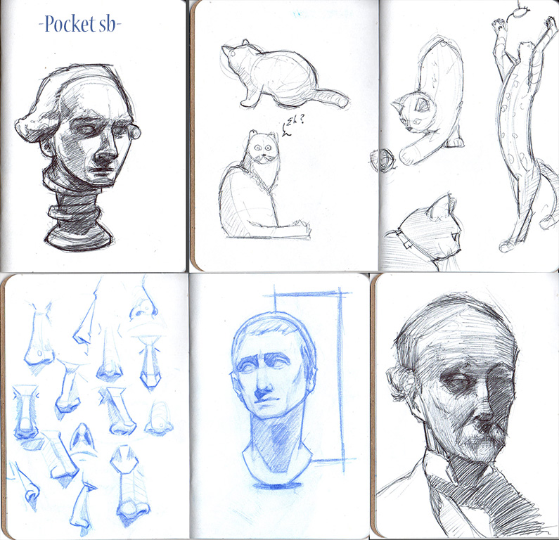 hey dude! great stuff man, love those blue sketches with the white highlights! and the pen stuff looks cool too! Not sure if you tried this exercise, where you just scribble a random shape and then make a face from it, it's really fun and useful to try and 'break out' of your visual library of faces and features - a lot of people's faces in reality do give a pretty cartoony impression after all!